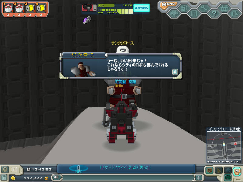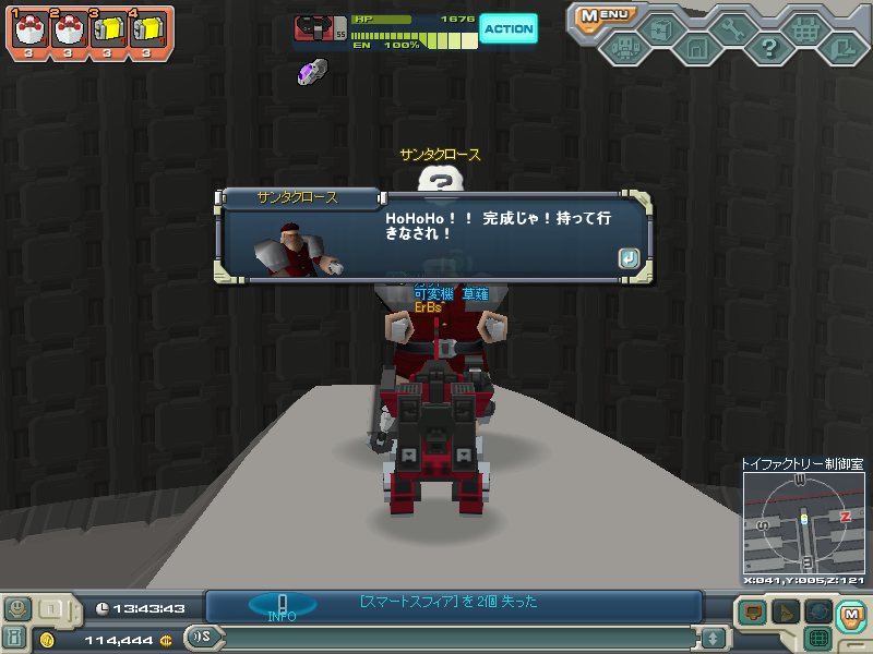 先に進むと妙にでかくて話し方がフランクなサンタが素材持ってきてくれたらパーツ作ってあげるといわれたのでさっそく一番難しいクリムゾンコースをやることに・・・